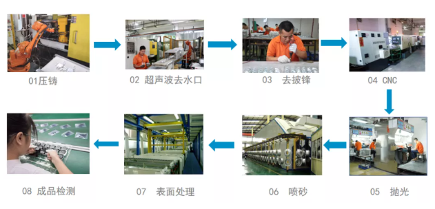 05、壓力壓鑄技術:將熔融狀態或半熔融狀態合金澆入壓鑄機的壓室,在高壓的作用下,以極高的速度充填在壓鑄模的型腔內,并在高壓力下使熔融合金冷卻凝固成型的高效益,高效率的精密壓鑄。